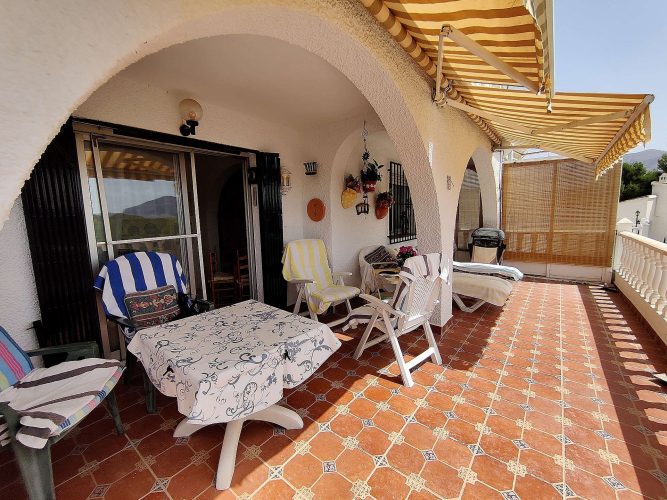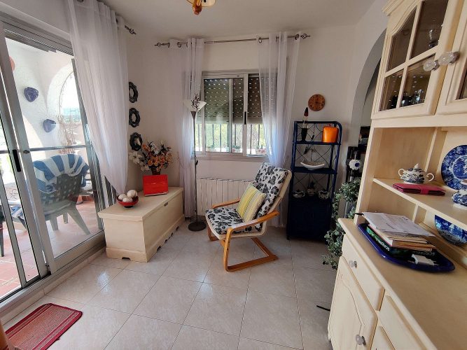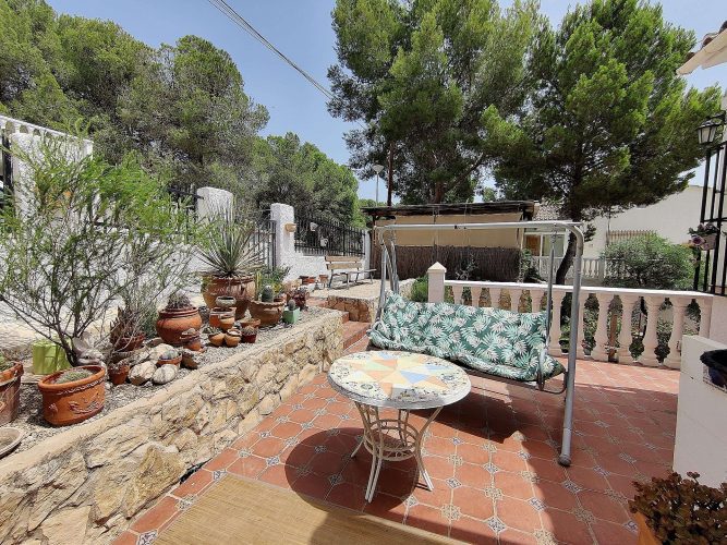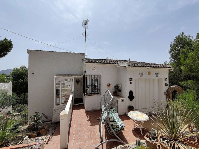 Detached Villa in Tibi with a covered pool. Detached Villa in Tibi on various floors, located in an urbanization with a mixture of nationalities, very closet o the town. The top floor as you enter the house from the street, has 3 bedrooms, 2 bathrooms and a garage/workshop, which could be made into another bedroom as there is already a car port outside.