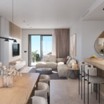 The interiors of the flats at El Lago stand out for their open and contemporary design, optimising natural light and space. Each unit features modern kitchens equipped with electrical appliances and high quality finishes. Bathrooms are fully furnished, offering functionality and style with fitted wardrobes in each bedroom to maximise storage. The integration of modern technology such as electric blinds and the option of air conditioning complement the comfort of the home. The interior design is elegant and practical, ideal for a comfortable and luxurious lifestyle in the vibrant surroundings of the resort.