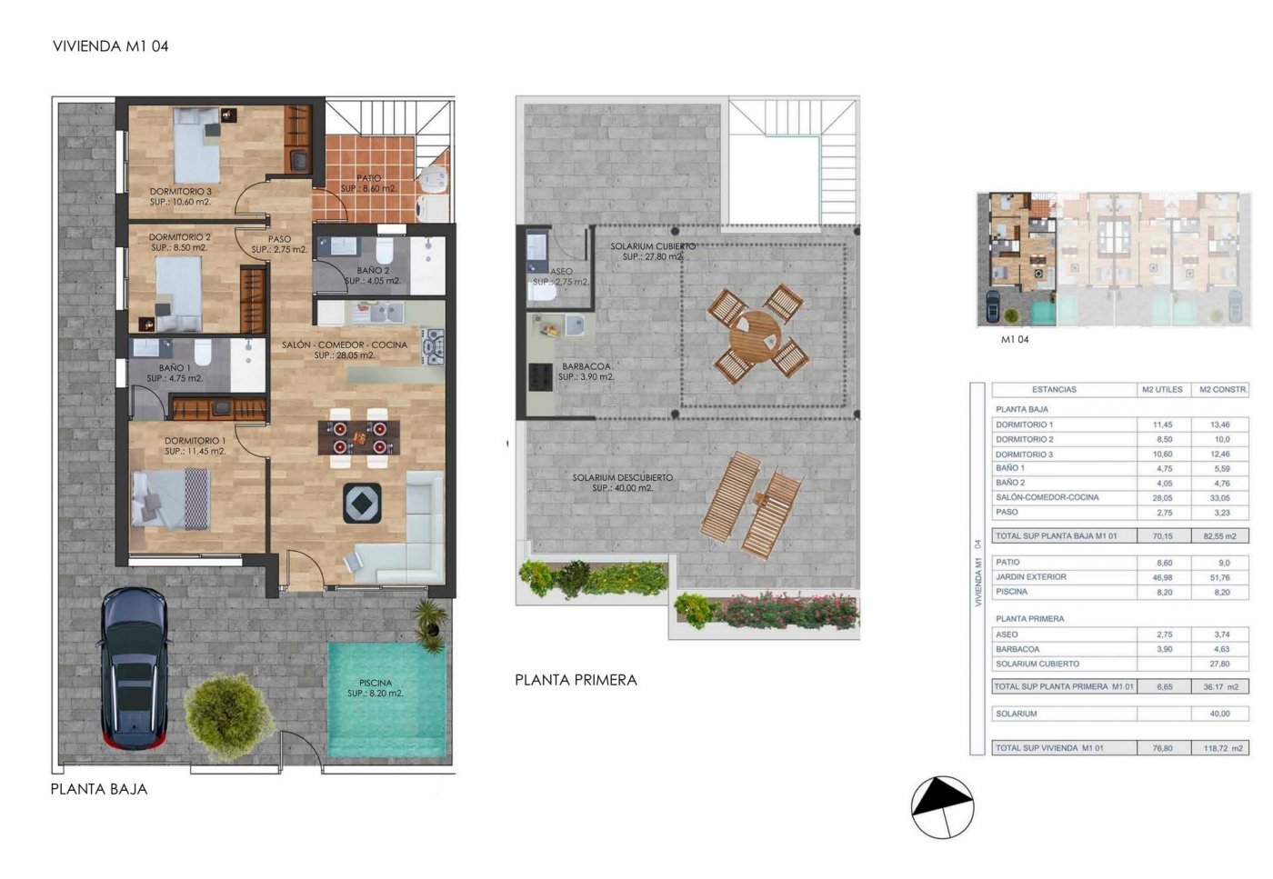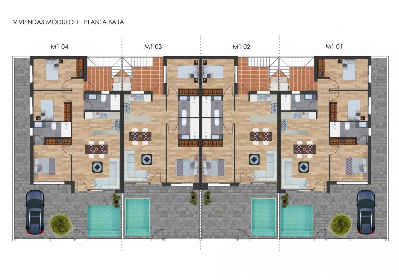 New Build complex of 2 corners semi-detached bungalow style villas and 2 townhouses located in Torre Pacheco, Costa Calida, Spain.