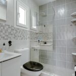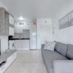 Inside, the apartment features a bright open-plan living and kitchen area with large retractable doors that open fully onto the private terrace, allowing you to make the most of the picturesque garden views. The living space also includes air conditioning for year-round comfort. The open plan kitchen is also stylish with modern appliances.