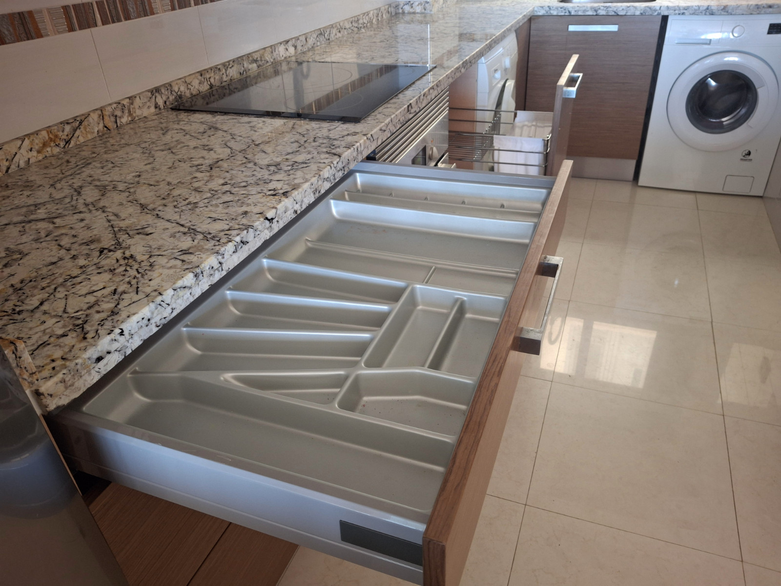 Designer kitchen: Marble countertop with double edging, cutting-edge cabinetry, and up-to-date appliances.