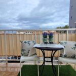 Inside, the apartment features an open-plan living and kitchen area with air conditioning, direct terrace access, and a fully equipped kitchen including a washing machine. The master bedroom is a spacious, light-filled double with a fitted wardrobe, while the guest bedroom is a comfortable single, also with storage. The family bathroom has been recently renovated with a walk-in shower and practical storage solutions.