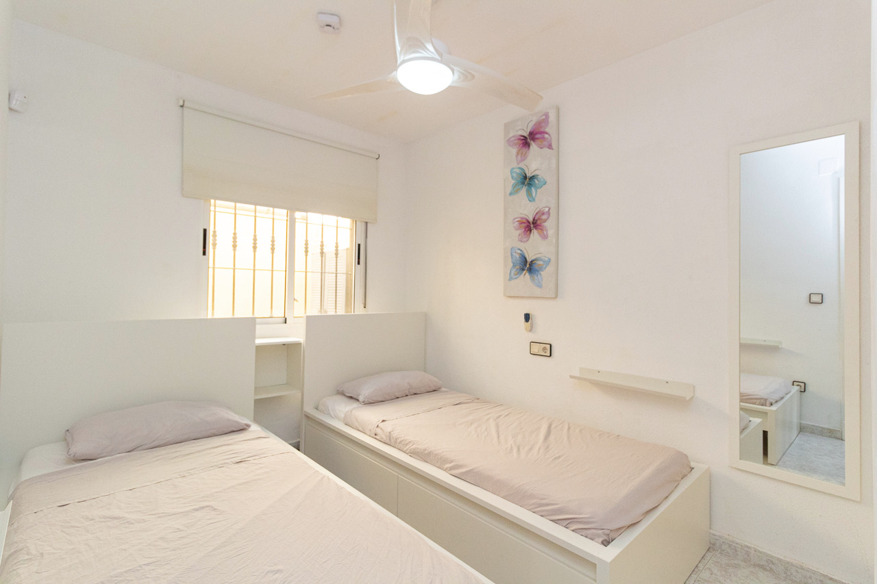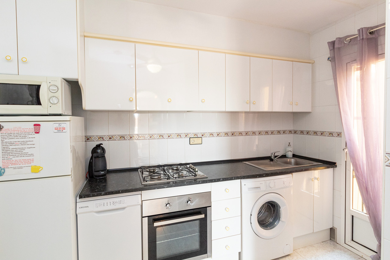 Well presented and bright ground floor apartment in La Siesta. This spacious home offers 3 bedrooms, modern bathroom, spacious lounge/dining room and independent kitchen with access to a rear courtyard, ideal for additional storage/laundry space. The property boasts a very spacious low maintenance patio garden and raised terrace for al fresco dining, brick built BBQ and retractable awnings to help with the summer sun and heat! The property has been renovated in the main and is in excellent condition, sold fully furnished with extras including air conditioning, ceiling fans, sun blinds and much more. Set on a complex with communal pool and gardens for residents, a short walk to the stunning salt lakes and local amenities of La Siesta. La Siesta features the recently opened La Siesta Park, which includes a large Pump Track for skateboards and BMX, three paddle tennis courts, and plenty of green space for outdoor activities. The area has a strong sense of community, with local churches hosting social events and gatherings, and it is well-connected to central Torrevieja, shops, and the coast.  Less than 5km to the beaches and port of Torrevieja. Contact us today for a viewing.