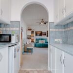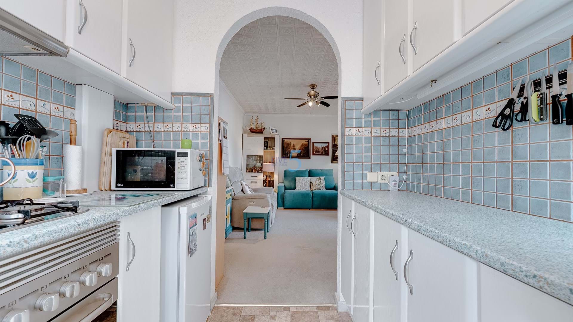 The home welcomes you with a bright conservatory with glass curtains, a TV/hobby room, ideal for enjoying the winter months. Inside, youll find a spacious open-plan living and dining area with air conditioning and ceiling fans, and a fully equipped kitchen with direct outdoor access. Both bedrooms are doubles with fitted wardrobes the master includes air conditioning, while the second has terrace access to a back conservatory currently used as an office or reading room. The family bathroom has been fully renovated with a modern walk-in shower, heated towel rail, and LED mirror.
