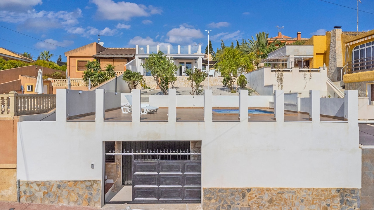 This unique villa is totally renovated, inside and outside with a lot of outside space! It has a 48m2 garage with electric doors which fits a car and a lot of space for storage. The plot is 600m2 and contains a pool area and a 28m2 pool, beautiful garden with lemon trees etc., an outdoor kitchen with associated outdoor dining area. The house is 120m2 and have three bedrooms and two bathrooms, new fully equipped kitchen with an open solution to the Livingroom and direct access to the outside dining area. On top of that it has a solarium with amazing views over Los Balcones, sea, and the Pink Lakes. Underneath the house you have more space for storage or equipment’s like bikes, gardening tools etc.nbsp;