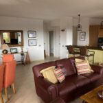 The spacious living-dining room offers access to the large terrace with partial sea and mountains views.
