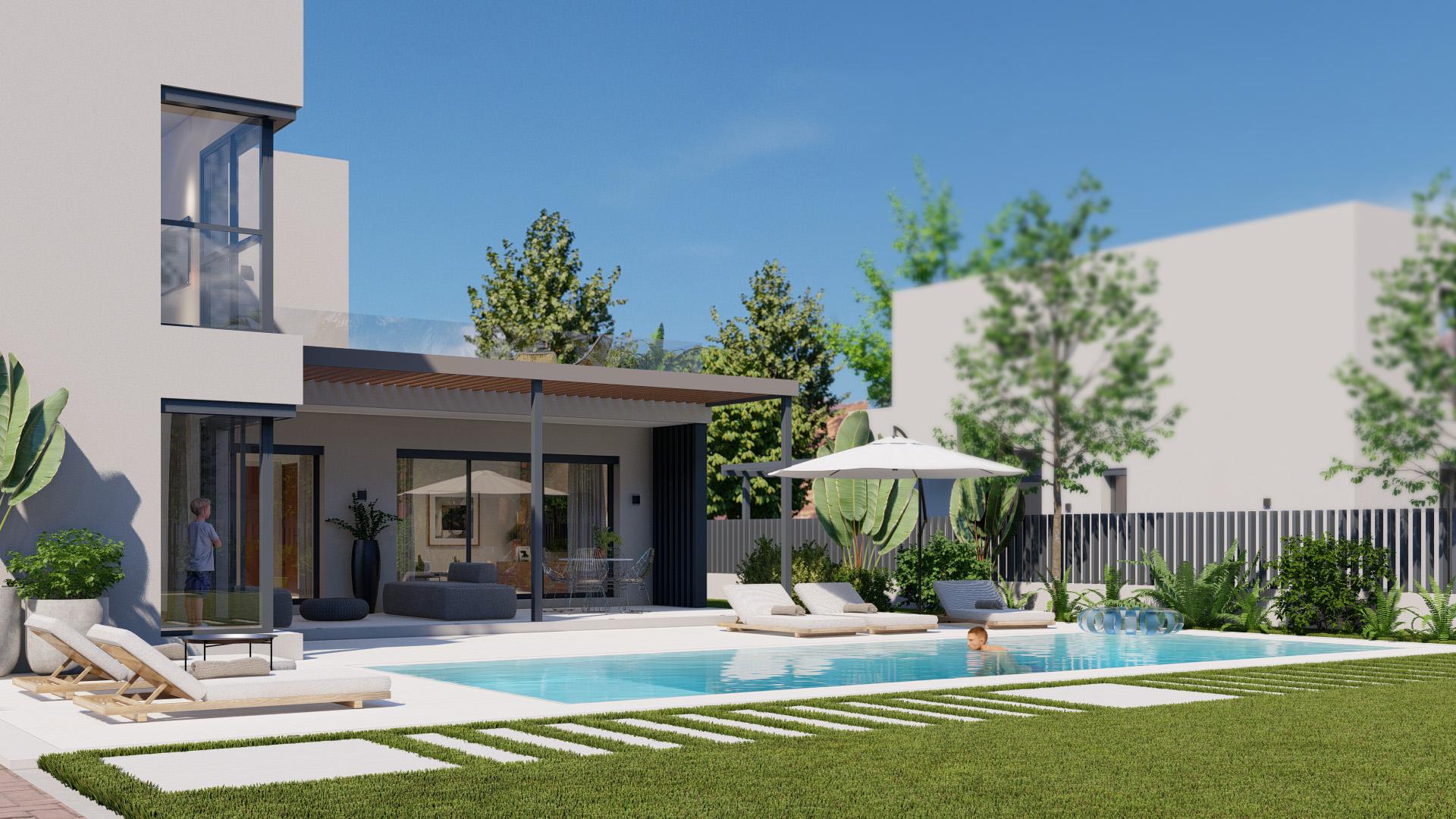 Modern design new build Villas with 3 bedrooms, 3 bathrooms, very bright, south and east orientation, situated on plots over 1,000 m2, with about 250 m2 built, and a porch for 2 cars.