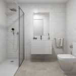Bathrooms with modern finishes, including towel heaters, glass-enclosed shower trays and built-in furniture