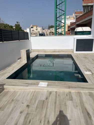 The private saltwater swimming pool of 2.5 x 6 meters has an internal staircase and a stainless steel shower