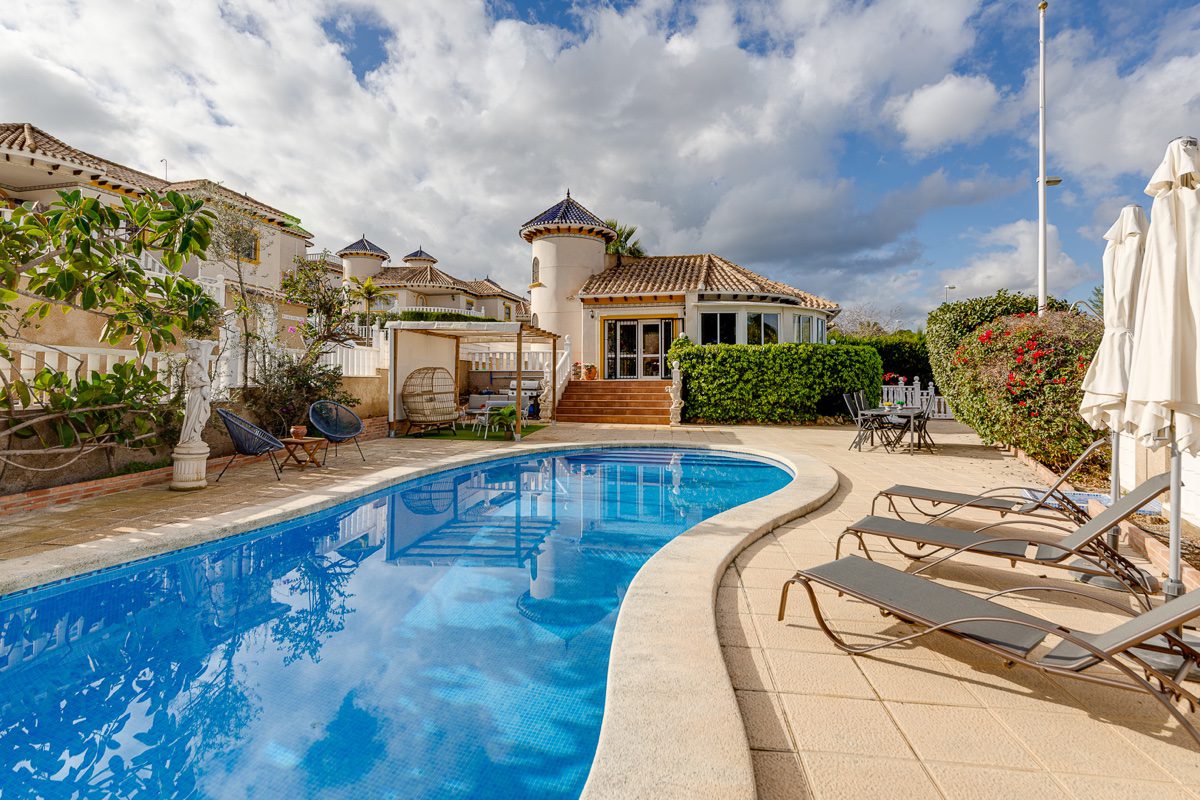 This well presented 4 bedrooms, 2 bathrooms Villa is located on a large plot of 550m2 with an impressive 164m2 living space. Situated on Pinada Golf 1 in Villamartin this villa is just a short walk from amenites including the Villamartin Plaza and Golf Course. A well finished villa with modern interior, private swimming pool and garage allows this property to be an amazing holiday or even permanent home. Viewings are highly recommended to appreciate all on offer.