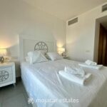 The master bedroom features a double bed, built-in wardrobe, air conditioning, and an en-suite bathroom with a bathtub and double basins, as well as beautiful sea views. The second bedroom is fitted with two single beds, a built-in wardrobe, and air conditioning. In addition to the en-suite, there is a second full family bathroom with a shower tray.