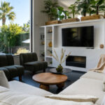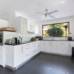 New kitchen with direct access to the outdoor terrace. The living room and recreational area is one level down, with beautiful natural light coming in from the full-size windows facing the garden/pool area.