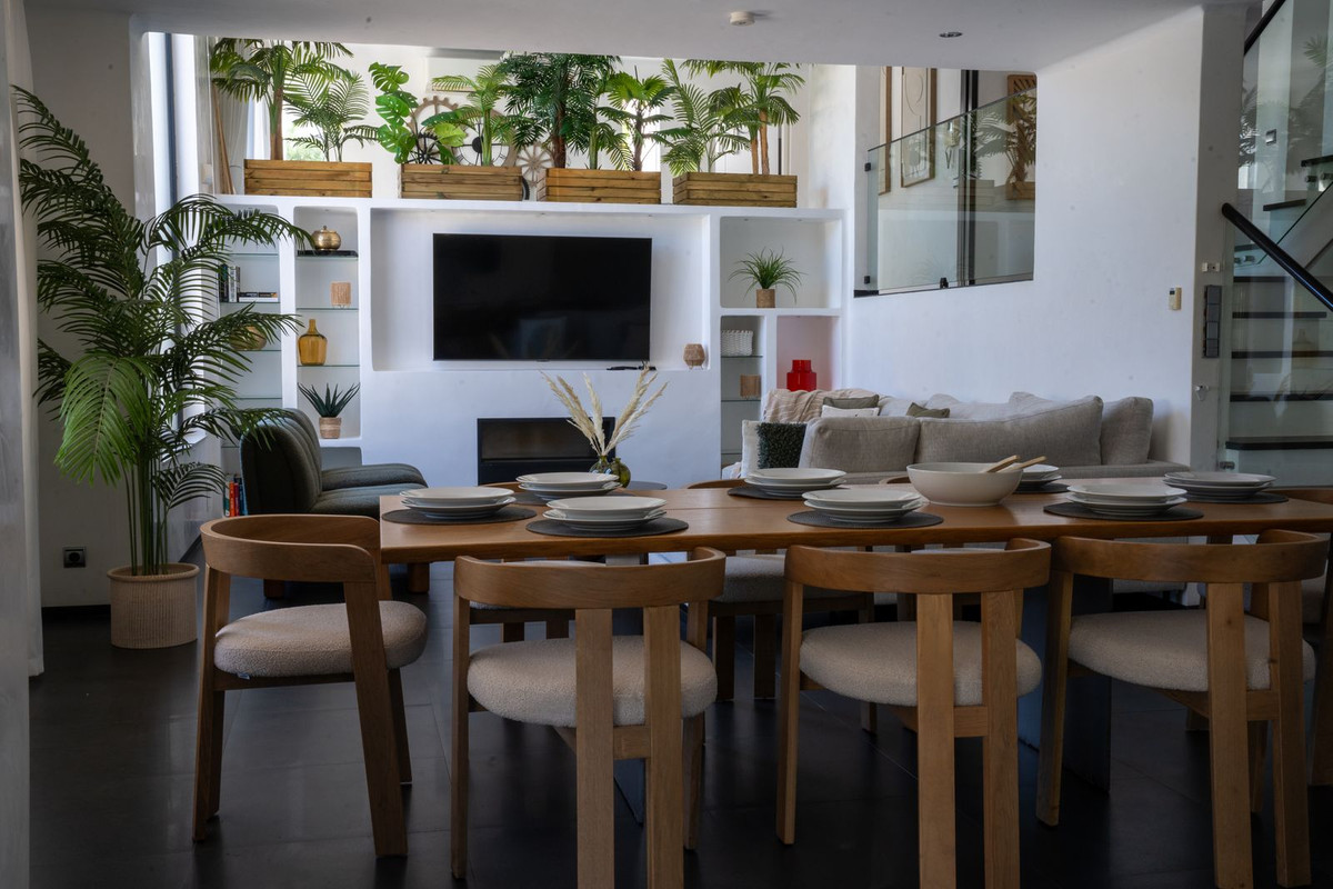 This newly renovated villa is built to a high standard in 2 levels and combining a modern design with Andalucian features. When entering this remarkable villa the modern architecture harmonious melt together with a 400-year-old Olive tree left in peace outside the glass construction. You instantly feel at peace while exploring the rest of the beautiful house. Straight ahead the living presents itself in an open plan situation where you find – on entrance level to the right – the fully equipped kitchen with dining area for 6 and a separate dining area for 8 persons. From the kitchen area, there is direct access to the laundry room with washing machine and tumble dryer.